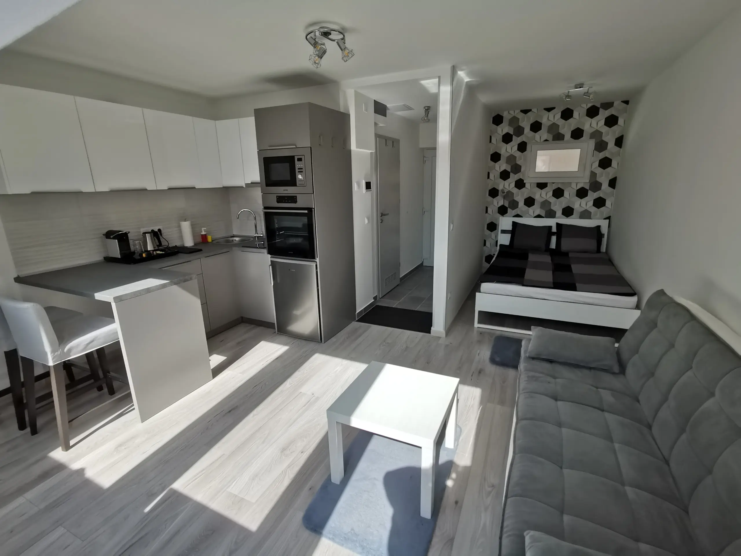 A stílusos belső tér a letisztult, modern design és a funkcionalitás ötvözete: a nappali és háló egyben egy otthonos, világos térben kapott helyet, ahol egy kényelmes franciaágy gondoskodik a nyugodt pihenésről. A teljesen felszerelt konyha és a modern fürdőszoba pedig minden igényt kielégít – akár rövid, akár hosszabb tartózkodásról legyen szó.